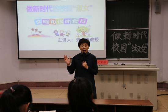 为了让同学们了解礼仪的重要性,锻炼他们的气质,也为了提高同学们日常的人际交往能力以及为人处世的礼仪问题11月5日晚马克思主义学院在齐贤楼2210举行了由史玉华副教授主讲的以“塑造美丽形象,展示优雅姿态——做新时代的淑女”为主题的专题讲座。