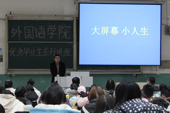 11月21日下午,在至善楼3237教室,迎来了外国语学院的优秀毕业生刘锐博士。刘锐学长此次重返母校,是为了给学弟学妹们传授一点过来人的经验,给同学们未来的四年生活提出自己的建议。出席本次讲座的有:外国语学院院长韩泽亭,党总支副书记刘希美,副院长张学祥、17级辅导员李岩、16级辅导员徐斐和18级全体同学们。