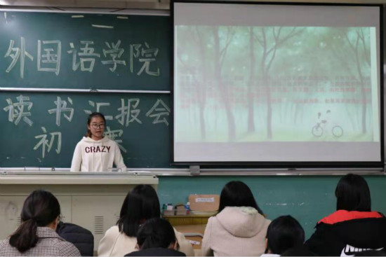 为提高同学们的阅读兴趣,贯彻落实国家“全民阅读”的政策,外国语学院于11月23日晚7点在至善楼3228教室举行读书汇报会初赛,比赛现场选手们热情高涨,竞争激烈。