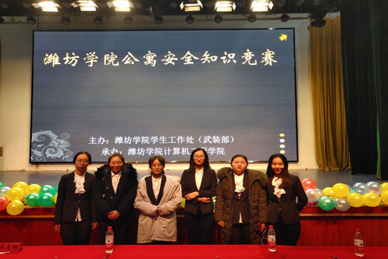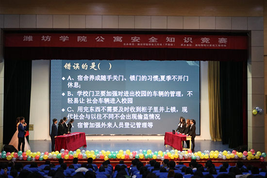 11月27日下午,由潍坊学院学生工作处主办,潍坊学院计算机工程学院承办的潍坊学院公寓安全知识竞赛决赛在潍坊学院图书馆报告厅隆重举行。学生工作处副处长张付功、学生工作处副科长边洪燕、计算机工程学院党总支副书记任秀洁、计算机工程学院学生工作办公室主任高连宏等领导老师组成评审团进行评审。共有外国语学院、教师教育学院、传媒学院等十二支代表队参与本次比赛。