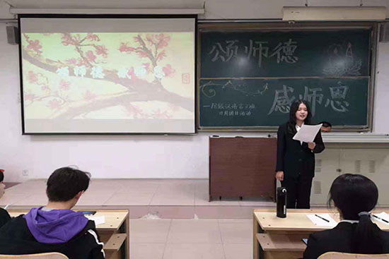 为表达对姜述凤老师的思念和敬重,歌颂教师的伟大,加深对老师这一职业道德的认识,文学与新闻传播学院2018级汉语言文学三班团支部于11月28日晚上在6108教室进行了以“颂师德,感师恩”为主题的团日活动。