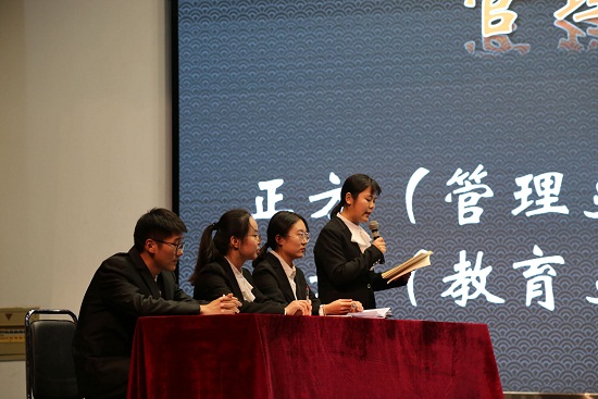 两个环节过后,来自马克思主义学院的法超群带来了一首《漂洋过海来看你》,优美的歌声回荡在整个报告厅里,让大家的浮躁心情也逐渐宁静下来,见大家都调整好了心态,最后一个环节——辩论也终于和大家见面,马克思主义学院代表队对阵外国语学院代表队,观点执反方“宿舍安全中教育最重要”。面对对方咄咄逼人的发言,马克思主义学院代表队的队员们则镇定自若,一辩马超纪声音洪亮,把己方的观点陈述清楚:“教育让人知道怎么做才是对的,教育让人心愿诚服的改变思想,改变行为。综上所述,我方重申,宿舍安全中教育比管理更重要,谢谢大家!”对方二辩立刻回言反击,抛出一个又一个难以回答的问题,我方二辩王文倩从容的拿起话筒,针对对方的发言指出他们的漏洞,三辩张晓君则进行补充说明,其思维缜密,语言犀利抓住要害,赢的在场观众的阵阵掌声。最后,四辩赵霞进行了总结,重申本方观点教育更重要。比赛结束后,评委们立刻进行了紧张的统分阶段,最终马克思主义学院代表队荣获三等奖。
