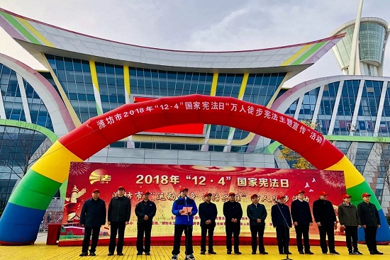12月4日上午,根据学校学生工作处安排,由潍坊学院历史文化与旅游学院50名大学生朝阳服务队成员组成的志愿小组在团总支副书记姚灵忠的带领下来到市府广场,参加了潍坊市2018年“12·4”国家宪法日“运动健身、法治兴潍”万人徒步宪法主题宣传、万人学习宪法签名活动。