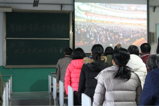 为纪念改革开放四十周年,外国语学院于12月18日上午,在至善楼3135教室举行师生集体收看庆祝改革开放四十周年大会直播活动。外院全体老师及部分同学参加此次活动,一同回顾总结了在改革开放四十年中,我国建设取得的伟大成就和宝贵经验。