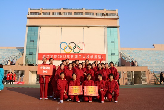 为了庆祝改革开放40周年,弘扬我国优秀传统文化,丰富我校教职工的文化生活,潍坊学院于12月20日下午在学校操场举办了全校教职工太极拳展演活动。潍坊学院党委副书记王清明出席了活动,传媒学院教职工积极参加了本次活动。