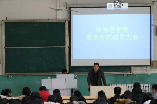 为督促同学们好好复习,明确考风考纪,强调诚信考试的重要性,外国语学院于12月26日上午于至善楼3136举行2017级考风考纪专题大会,于上午10点于3237举行2018级期末动员大会。17级会议由17级辅导员李岩老师主持,党总支副书记刘希美老师、外国语学院副院长张继文老师出席会议。18级会议由18级辅导员卢术强老师主持,外国语学院院长韩泽亭院长、副院长张学祥老师出席会议。