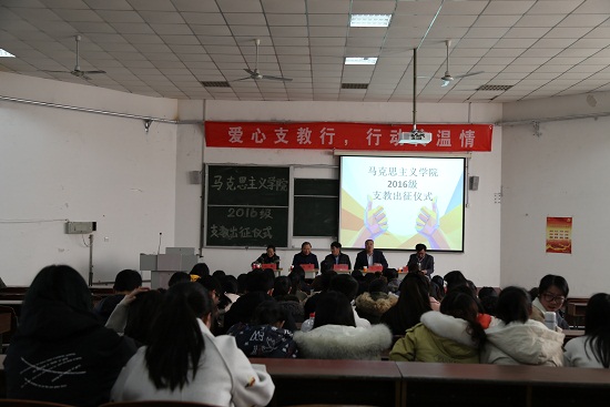 为深入贯彻落实党的十九大精神,支援偏远乡村及教师资源缺少地区的中小学教育工作,推动大学生支教工作的顺利开展,让同学们在出征时有一个良好的心态和坚定的信念,鼓舞士气,增加斗志,做好支教的充足准备,2月25日下午潍坊学院马克思主义学院于齐贤楼2109教室举行了支教出征仪式,出席仪式的领导有马克思主义学院党总支书记陈子文、院长刘勇、副院长于民,学生工作办公室主任赵静、实习带队老师张光波以及2016思想政治教育专业的全体学生参加。