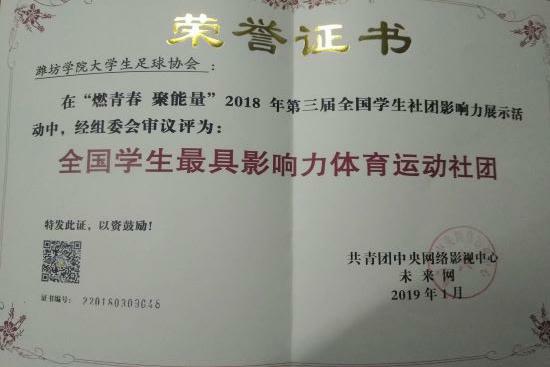 在潍坊学院体育学院团总支书记卢永波老师的带领,体育学院2017级体育教育专业肖宇帆协助,体育学院全体同学的大力支持下,潍坊学院大学生足球协会荣获“全国学生最具影响力体育运动社团”。
