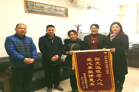 1月8日,为感谢大学生阳光爱心协会的帮助,松鹤居老年公寓赠与大学生阳光爱心协会“阳光温暖老人心,爱心奉献情意真”荣誉锦旗。