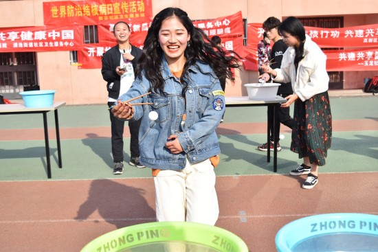 本次活动以“开展终结结核病行动,共建共享健康生活”为主题,以提升体质健康为宗旨。伴随着领导们的讲话,本次活动拉开了序幕。接踵而来的是好玩有趣的项目,首先是夹乒乓球项目,一人用筷子从有球的盆里夹球,放到另一张桌子上的空盆里,在1分钟内夹乒乓球多者为胜。同学们对这个项目跃跃欲试,都取得较好的成绩,夹乒乓球项目打响了本次活动的第一炮!与此同时,踢保龄球和抛接绣球活动如火如荼进行着,有关肺结核疾病的知识问答穿插其中。随后,最让人期待的集体活动“转风火轮项目”开始,在此考验凝聚力与配合度的项目中,建工学院派出孙振钊同学为龙头,王桂源同学为龙尾,其他同学在中间支撑,八人共同努力,轻松默契的完成了比赛。最终,建工学院在本次活动中荣获“优秀组织奖”。