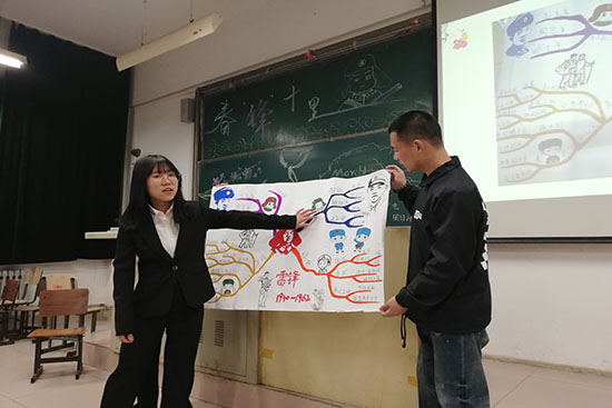 接下来,张亚楠小组为大家展示了成员们精心制作的雷锋画像和雷锋大致事迹图。画像栩栩如生、新颖别致,在座的每一位同学都为之惊叹,在这一片赞许声中同学们也进一步熟悉了雷锋同志和他的助人精神。随后,第四小组汇报人黄奕采进行了她们组“雷锋精神问卷调查”的汇报。她的汇报分为两部分,包括此次问卷调查的相关回答情况以及通过本次问卷调查得出的结论。她通过精心制作的ppt和生动准确的语言向大家展示参与问卷的学生们关于雷锋精神的了解程度、雷锋精神在日常生活中的影响、学习雷锋的途径和频率等情况。