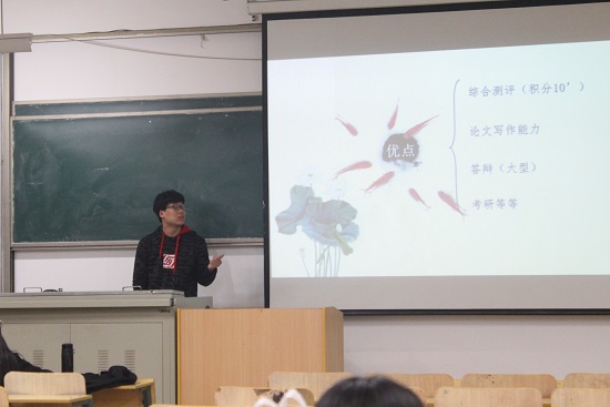 杨旭分别在三个教室详细介绍了SRTP的相关事宜。首先,杨旭进行了简单的自我介绍,随后即开始对SRTP展开讲解。杨旭解释到SRTP是为在校本科生设计的一种科研项目资助计划,采取项目化的运作模式,通过设立创新基金和本科生自主申报的方式确定立项并给予以资金支持,鼓励学生在导师指导下独立完成项目研究。接着,杨旭通过往年的立项实例向同学们推荐了几个研究方向,并结合实际情况介绍了SRTP的优点以及对未来的影响,例如,锻炼自己的论文写作能力,提高大型答辩能力等等。最后,杨旭介绍了SRTP相关报告的填写注意事项,如字数要求以及调版合理等等。活动接近尾声,杨旭结合自身经历,向同学们阐述了自己的体会和感受,他表示,每个人选择不同,注定将来成为不同的人,不要管他人评价是怎样,努力成为自己想成为的人。