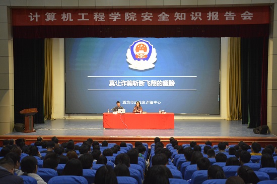 4月1日下午4点,计算机工程学院特邀潍坊市反信息诈骗中心马成龙警官,在图书馆报告厅举办了以“莫让诈骗斩断飞翔的翅膀”为主题的安全知识报告会。会议由计算机工程学院党总支副书记任秀洁主持,学生工作办公室主任高连宏,团总支副书记肖甲波,辅导员侯刚、徐丽丽、王慧榕,学生会学生干部以及2018级全体学生聆听了报告会。