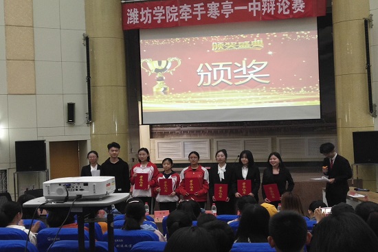 本次活动由寒亭一中团委、潍坊学院团委、潍坊学院社团联合会共同组织,活动伊始,由主持人简单介绍了到场评委以及辩论双方队员。随后寒亭一中与潍坊学院大学生争鸣社分别作为正反方,以“IQ、EQ孰更重要”为辩题展开激烈的辩论。双方辩手引经据典,旗鼓相当,互不相让。最终辩论赛以反方胜利而告终,最佳辩手为反方二辩与正方四辩。精彩而紧张的辩论赛结束,双方辩手又以“与人相处时,是该说我想说的,还是说我想听的”为辩题展开了一场气氛较为轻松的即兴辩论赛,双方辩手即兴发挥,畅所欲言,友好交流。活动接近尾声,辩手与评委们进行合影留念。