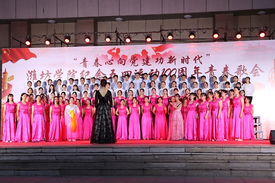 为了纪念五四运动100周年,弘扬五四精神,同时推动大学生科技文化艺术节的进行,5月9日由党委宣传部和团委组织的“青春心向党·建功新时代”纪念五四运动100周年青春歌会在行政楼后广场举行,潍坊学院党委副书记王清明、各学院团总支副书记相关部门和各学院分管学生工作负责人来到比赛现场,音乐学院的五位老师担任评委。