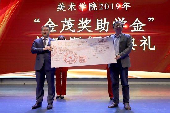 典礼现场,庄玉冰先生向美术学院捐赠了善款,美术学院院长周晓光向金茂国际大酒店回赠了学院师生的油画作品。美术学院副书记刘雪梅宣读了“金茂•卓越奖学金”、“金茂•助学金”、“金茂•风景写生奖学金”和“金茂•爱心公益基金”获奖名单。与会领导为获得“金茂奖助学金”的60名学生和七色花大学生志愿服务队颁发了奖金。获奖学生代表王丽琪、宋义普分别做了作了典型发言,获奖学生一致表示,将用心感悟金茂大酒店创业的艰辛,深刻领会设立金茂奖助学金的初心本意,时刻牢记金茂大酒店的爱心善举,以优异的成绩和出色的表现回报爱心捐助。七色花大学生志愿者服务队以视频的形式汇报了一年来开展志愿服务情况,并表示将以更加昂扬的姿态和饱满的热情,投入到每一次志愿服务中,努力传递爱心,服务社会,为社会公益事业贡献青春力量。