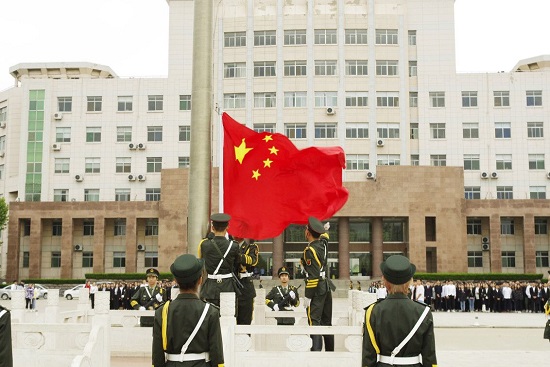 6点40分,升旗仪式隆重开始。国旗护卫队的旗手们迈着整齐、英武、威严的步伐护送五星红旗,伴随着神圣、嘹亮的国歌声,五星红旗冉冉升起,在场的每一位都深情地向五星红旗行注目礼。场面庄严肃穆,师生郑重专注,表达着对祖国无限的热爱和崇高的敬意。