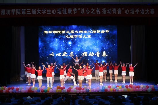 为提高大学生的心理健康水平,增强大学生的心理保健意识,潍坊学院于5月29日下午2点40分,在图书馆报告厅举办第三届大学生心理健康节“以心之名,指动青春”手语大赛。