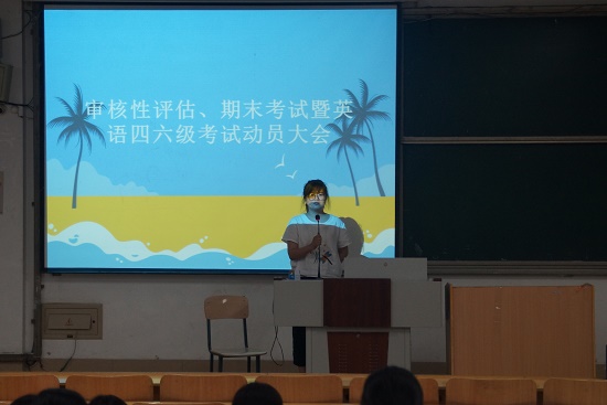 大会上,吕静老师首先强调了在审核性评估期间应该注意的事项,严禁学生请销假和离开学校,严格要求学生一日行为规范,注意上课纪律,抓好宿舍安全隐患排查和安全整顿工作。接着,吕静老师就即将到来的英语四六级考试相关事项进行通知,强调了四六级考试的纪律和重要性,希望参加考试的同学们珍惜考试机会,及时做好准备工作。针对即将到来的期末考试,吕静老师列举了潍坊学院大学生领取毕业证的条件,以及数学学院2019级毕业生的毕业情况。借此向同学们强调期末考试的重要性,要求同学们以高目标、高标准严格要求自己。其次,希望同学们调整心态做好复习工作,严禁出现考试作弊的现象,强调了考试作弊的后果。最后,吕静老师希望同学们可以沉着应答,诚信应考。