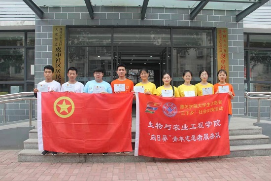 为配合推进党员双报道活动,7月17日,潍坊学院生物与农业工程学院向日葵青年志愿者、学生党员在大虞街道虞中社区开展为期一个月的暑期社会实践活动。