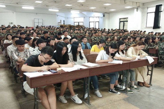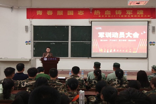 9月15日下午,美术学院在荟萃楼1109举行主题为“青春报国志 热血铸军魂”2019级新生军训动员大会。中国人民解放军71602部队教官于帅、孙志鹏,美术学院党总支副书记刘雪梅,团总支书记江浩浩,全体辅导员、全体学生党员和2019级新生一起出席了动员大会。