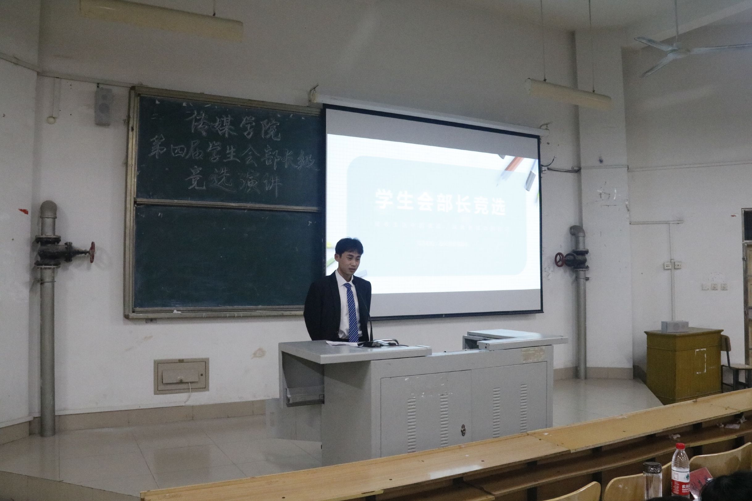 10月9日晚,传媒学院第四届学生会部长级公开竞选演讲在天一楼7512教室顺利举行。传媒学院党总支副书记刘先学,学生工作办公室主任徐金德,团总支书记杨颂,2018级辅导员辛桂京以及第四届学生会主席团成员担任评委,传媒学院2019级全体同学观看了本次竞选。