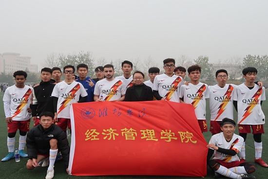 11月17日,经济管理学院和体育学院于潍坊学院操场举行了学生组足球联赛。经济管理学院团总支副书记于敏莅临现场为经管加油助威。