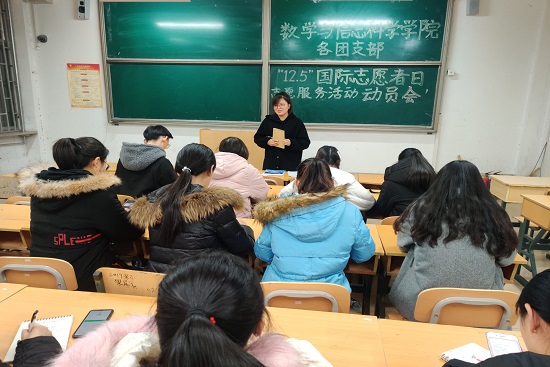 在“12·5”国际志愿者日来临之际,为弘扬“奉献、友爱、互助、进步”的志愿者精神,潍坊学院数学与信息科学学院于12月2日晚在人合楼8119教室召开“12·5”国际志愿者日志愿服务活动动员会。此次会议由辅导员吕静老师主持,潍坊学院数学与信息科学学院2018级、2019级各班团支书参加。