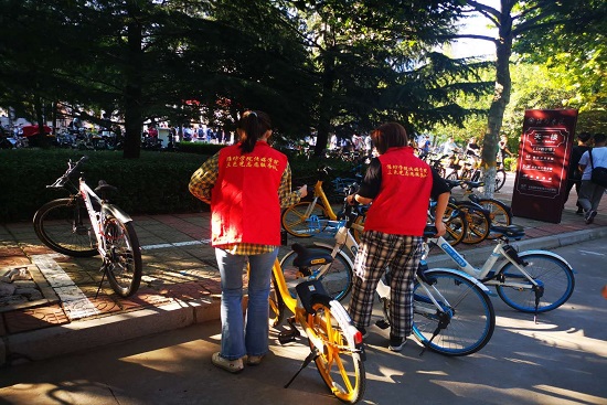 活动当天,志愿者们分成三个小队,分别在早、中、晚三个人流量高峰期引导学生规范停放自行车并把路旁随意摆放的自行车摆放到指定的区域内。志愿者们站在经常被自行车占据的汽车停车位旁边,看见有同学想要放置自行车就会走上前去轻声提醒并告知自行车正确的摆放位置。自身的规范行为可以影响身边的人,有不少学生在看见志愿者在摆放自行车后,自觉将车辆停放在正确位置,甚至帮助志愿者搬挪摆放不整齐的车辆。除此之外,校园里还存在一些随意停放在路旁、长时间不使用翻倒在地的自行车,志愿者将它们进行重新摆放,原本杂乱无章的停车区变得井然有序,志愿者们还提醒同学们要注意锁好自行车,避免自行车丢失,志愿者们用实际行动支持创城、参与创城。