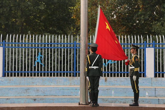 第一项,升国旗,奏国歌,全体师生行注目礼。鲜艳的五星红旗伴着初秋的微风缓缓升起,每一位师生都端正姿态,庄严肃穆。升国旗仪式后,2020级新生以营为单位组成五个方队在主席台前进行会操表演。马克思主义学院组成的女子方队,即四营19连,作为第四个方队进场。经历一周的训练,教官的嗓子已经有了些许沙哑,但这并不影响教官的指挥。在教官的指令下,同学们依次表演取放马扎、整理着装、原地四面转法、跨立与立定、蹲下与起立、稍息立正、敬礼与礼毕等军训项目。尽管方队中全是女生,但她们利落标准的动作、精神干练的姿态,诠释了“巾帼不让须眉”,展现了她们青春昂扬的风貌。项目表演完后,方队由教官带领跑步离开汇演场地。