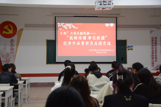 为增强学生对传销的辨别能力,提高艺术修养,10月28日19:30,美术学院“尽美”文创头脑风暴——“抵制传销,净化校园”优秀作品赏析及总结交流会在荟萃楼501举行,美术学院获奖学生参加。
