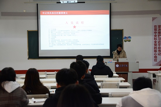 课上,王老师以“中国共产党党员的条件和标准”为题,从中国共产党党员的条件和标准;如何争取入党,成为合格党员;肩负历史的重任,做合格的共产党员三个方面向同学们讲述了大学生应该如何向党组织靠拢。王老师还结合伟大抗疫精神这一维度,引用丰富的例子,生动的语言,全面深刻阐释了共产党人为中国人民谋幸福的初心、为中华民族谋复兴的使命,明确了作为新时代大学生的立身之本、力量之源、正气之魂。最后,王老师告诫同学们,青年要用实际行动来践行跟党走的理想追求,要端正入党动机,在学习生活中以党员的标准要求自己,把学与用、说与做、知与行有机结合起来,学以致用,躬身实践,从思想和行动上磨练自己,争取早日成为一名合格共产党员。