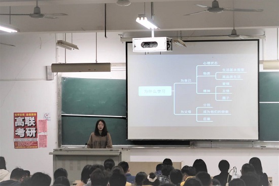 李彩祎同学通过PPT展示的形式分享了自己在学习和生活两个方面的经验。她提到,首先,学习要有明确的目标,要掌握学习方法,做到及时“复盘”;其次,大学生应该学会一个人生活,多参与社会实践,坚持运动不熬夜;最后她还在大会上进行了一次国家奖学金答辩的精彩演示,使同学们更好的了解了答辩的具体过程。接着,高心茹同学作以“梦想决定了人生的高度”为主题的演讲,她向同学们分享了她的三心:对待难的科目不要有畏惧心;对每一个题目要有谦卑心;一天不学习要有愧疚心。而后张杰同学从学习、工作活动和创新创业等方面告诫学弟学妹们一定要有良好的心态,要积极参加、认真对待每一个活动。最后,王海梅书记总结了本次活动。书记借用“世事洞明皆学问,人情练达即文章”告诫同学们要留心生活中的点点滴滴,用毛主席的话“好好学习,天天向上”来劝勉同学们要努力学习。
