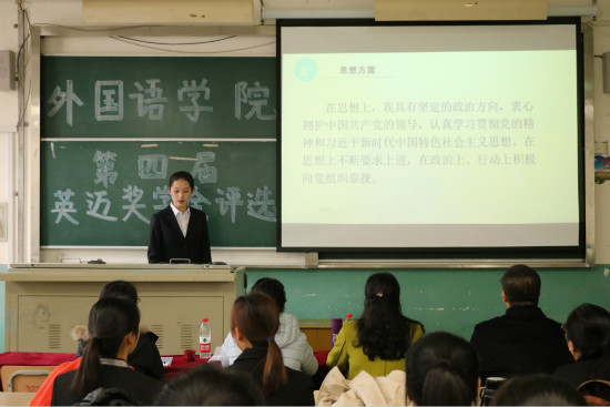 为了给同学们更多展示自我的机会,激励同学们努力学习,外国语学院第四届英迈奖学金答辩会于2020年11月19日下午在至善楼3228教室举行。外国语学院李青老师、孙丽丽老师和李艳华老师、李岩老师作为评委出席了此次活动,2018、2019级的20位优秀学生作为候选人参加了此次活动。