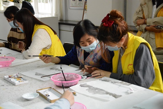 在社区的活动室,志愿者们从落笔姿势到运笔走势的每个细节进行讲解,并图文并茂地讲解一些具体的技巧,带着家长和孩子进行练习,大家在学习中收获了快乐。家长和孩子们虽然在生活中对国画接触较少,但是在学习过程中对国画产生了浓烈的兴趣。中国水墨画的核心就是笔墨。毛笔既是一种书写工具,又是抒发性灵的媒介。它圆润柔和又苍郁华滋,加上水墨的干湿浓淡的变化,令画面元气流荡、风神秀朗。自古以来,中国人的胸襟、风度都曾在这独特的笔墨中得以展现。童年时便学会使用这种工具与材料,领略它们的趣味性并躬身实践,无疑在孩子的心田深处撒播下了热爱传统文化的种子。经过3个小时的认真创作,一幅幅美丽的山水画作品映入眼帘。看着自己的作品,家长和孩子们都露出了满意的笑容。
