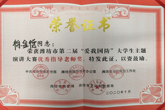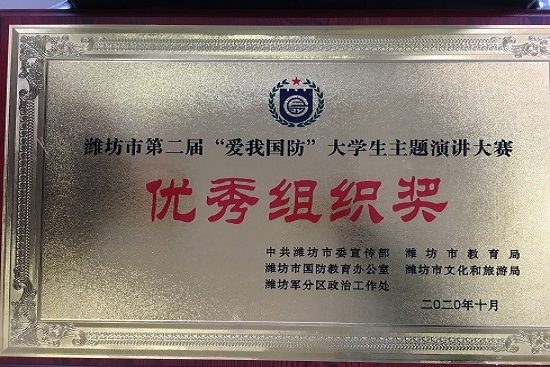 10月25日上午,由潍坊市国防教育办公室联合市委宣传部、军分区政治工作处、市教育局、市文化和旅游局共同主办的潍坊市第二届“爱我国防”大学生主题演讲大赛决赛在山东交通职业学院举行,我院的三组参赛作品从41组选手中脱颖而出,斩获两个一等奖、一个三等奖,潍坊学院荣获“优秀组织奖”,传媒学院学生工作办公室主任徐金德老师、2018级辅导员辛桂京老师荣获“优秀辅导老师”。