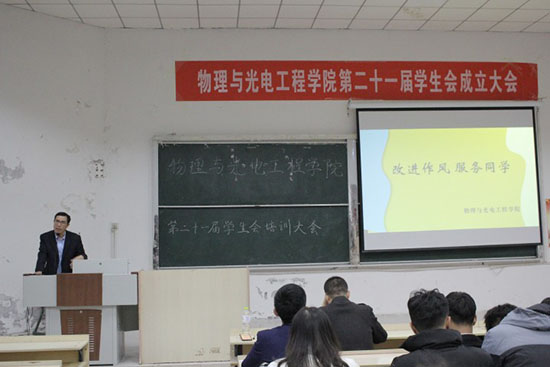 为弘扬实事求是、清正廉洁、艰苦奋斗的优良学生工作作风,使学生会干部明确职责、主动作为、奉献自我。2021年11月7日下午,物理与光电工程学院于明正楼5109室召开了以“改进作风,服务同学”为主题的学生会工作培训会议。本次会议由副科级组织员金波昌老师主讲,学生会全体成员参加。
