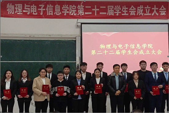 2022年11月6日下午,物理与电子信息学院在明正楼5109室举办学生会成立大会。学院党总支副书记于尔河,各年级辅导员、第二十一届学生会主席团代表以及第二十二届学生会全体成员、其他团学组织代表出席本次大会。