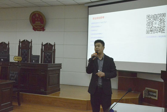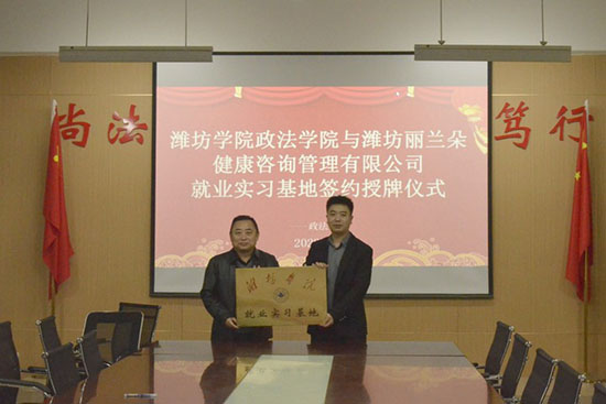2022年11月17日下午在人合楼8314会议室和8321模拟法庭分别举办了潍坊学院与潍坊丽兰朵健康咨询管理有限公司就业实习基地签约授牌仪式和大学生职业规划宣讲会,政法学院党总支书记曹兴波和企业代表刘家琳先生出席了此次活动。