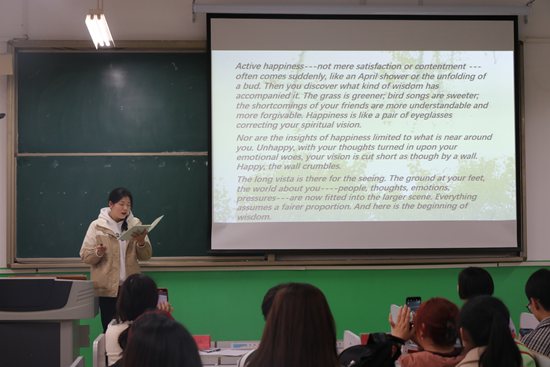 张学祥院长在赛前致辞中指出,朗诵的好处很多,其最高境界是审美。美好的人生,从用心阅读开始。文是语言中的精品,内容积极向上,句式丰富多彩,节奏动听悦耳,尤其值得我们用心体会,在朗读中感受生命的律动,任想象放飞驰骋,体验无处不在的曼妙与美好,感悟人生的喜悦与忧伤,锻炼公共演讲的勇气与自信,获取成长的方向与力量。他希望大家以此次美文朗诵比赛为契机,养成好读书,读好书的习惯。树立“昨夜西风凋碧树。独上高楼,望尽天涯路”的远大读书志向,培养“衣带渐宽终不悔。为伊消得人憔悴”之求索恒心与坚韧,收获“众里寻他千百度。蓦然回首,那人却在,灯火阑珊处”的惊喜。所有参赛同学精神焕发,带着微笑和自信依次登台展示,其语言生动形象,吐字清晰,节奏富有变化,举止从容端庄。最后学院领导和教师为获奖同学颁发了奖状和奖品。赛后,英语老师们给大家带来了精彩的诗歌朗诵表演,让同学们更为深刻地体会到了语言的魅力。