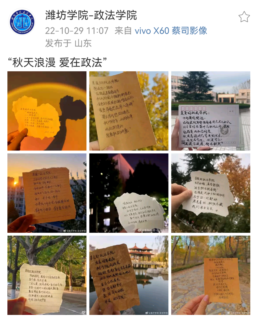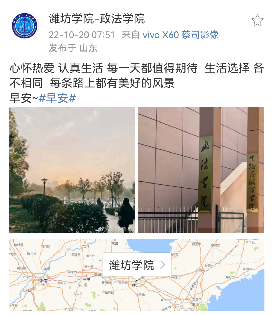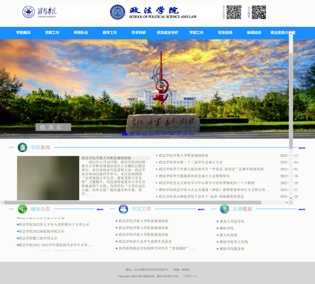 政法学院紧跟时代潮流,运用现代传媒技术,采取丰富多样的,同学们喜闻乐见的形式做政法学院的思想教育宣传工作,创建并运营“潍院政法”公众号和“潍坊学院——政法学院”微博,通过丰富多彩的推文让同学们更好的了解到政法学院的工作动态,日常事件,使思想文化教育得以贯彻落实,深入人心。