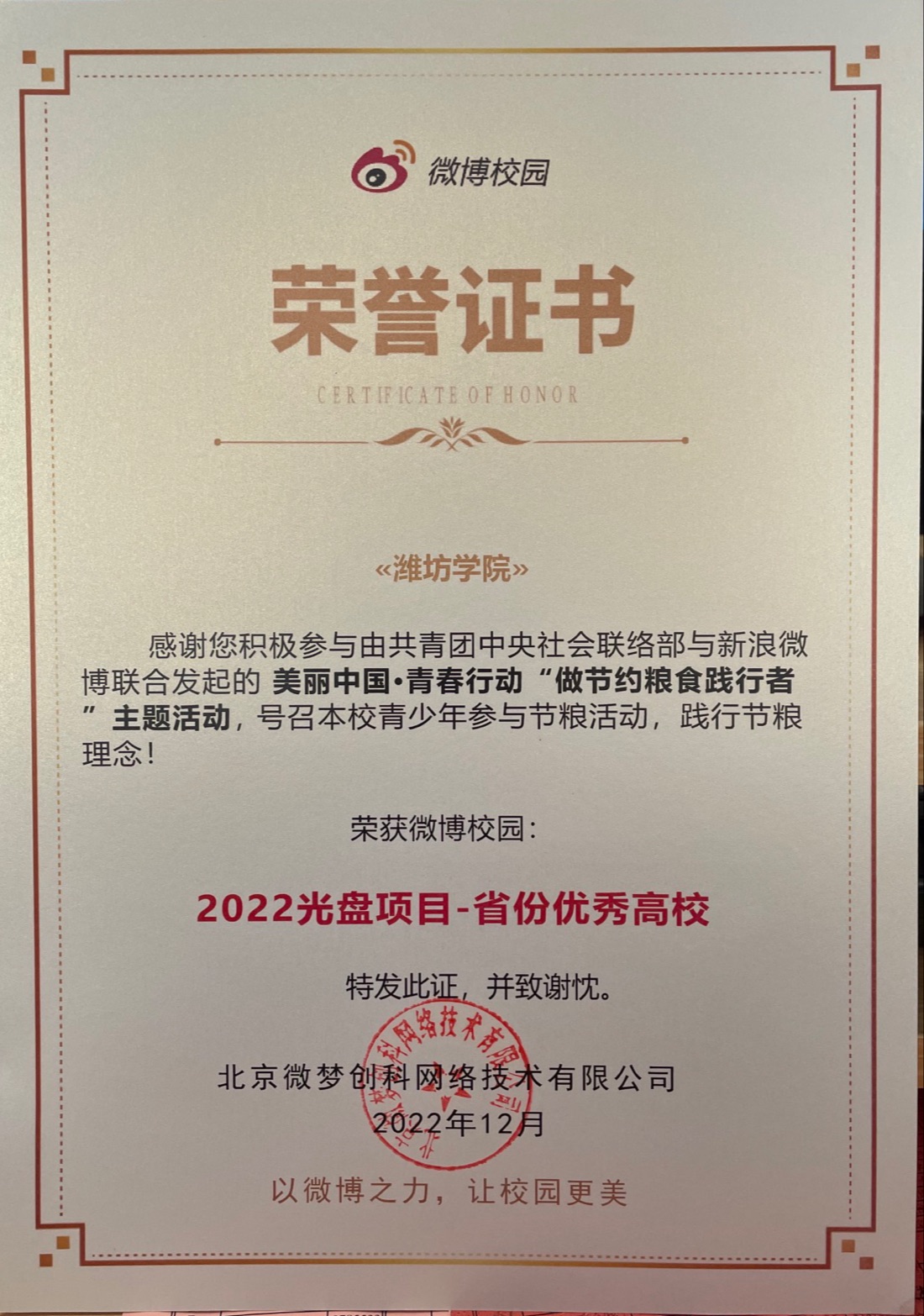 近日,美丽中国·青春行动“做节约粮食践行者”主题活动圆满落幕,学校获得2022光盘项目—省份优秀高校。