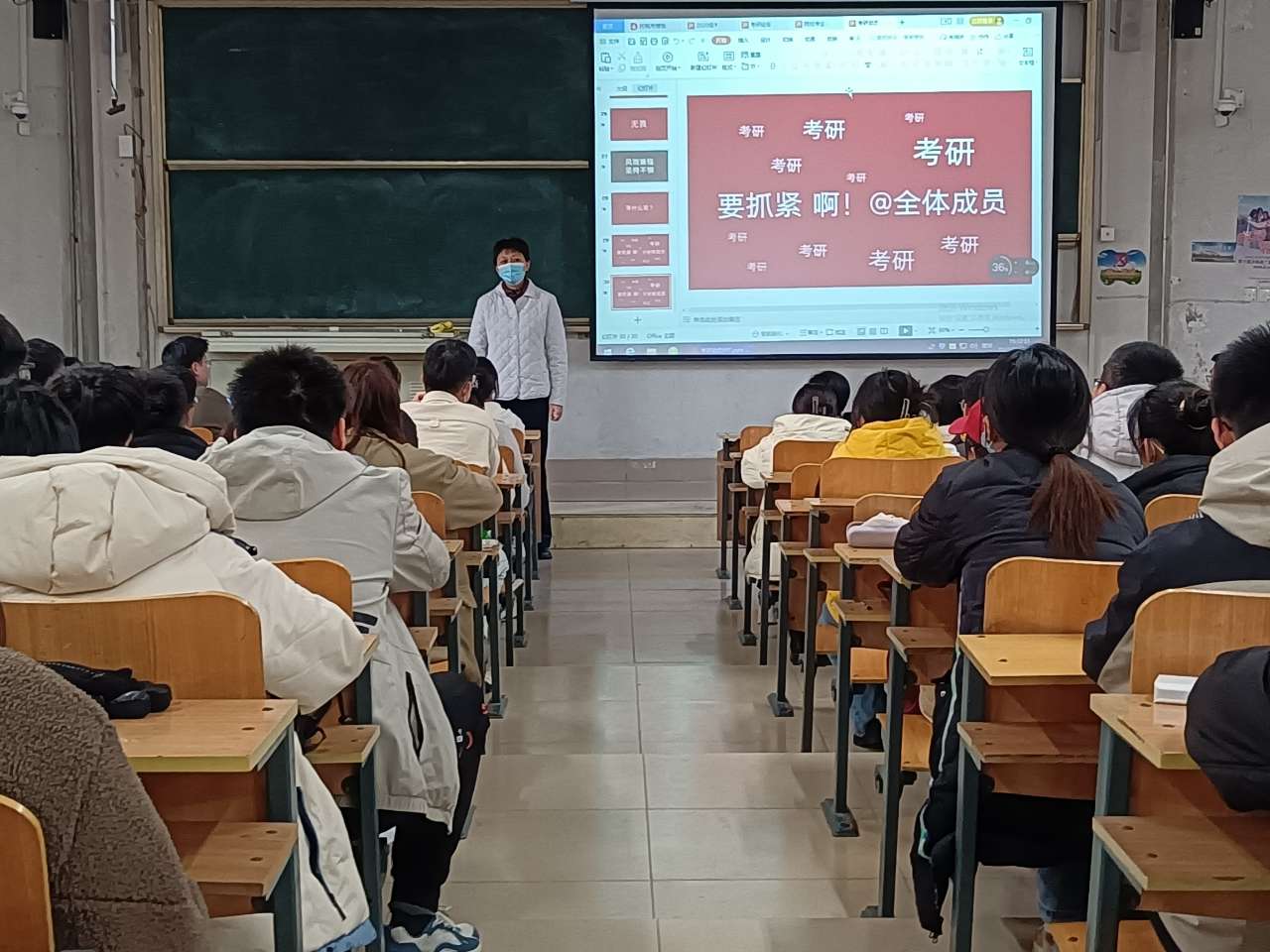 刘见学老师从考研现状、研究生招录情况等方面做了系统的讲解。刘老师表示,“考研过程中的选择至关重要,兴趣是最好的老师,要选择自己感兴趣的学科领域,以问题为向导、以目标为驱动,风雨兼程、坚持不懈、坚持到底”。盖枚岭老师基于专业课的角度从学校选择、前期准备工作、各科目学习干货分享和复试准备等四个方面进行考研经验分享,指出学硕和专硕的区别,为备考的同学们答疑解惑,并鼓励同学们,“当你上岸的时候,你会发现所有的努力都是值得的”。