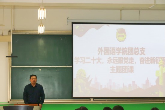 为了深入学习贯彻党的二十大精神,发挥党的二十大对实际工作的指引作用,引导青年学子切实增强对中国特色社会主义的理论认同感、政治认同感和思想认同感,2023年3月9日下午2点30分,外国语学院于至善楼3236教室举办了“学习二十大、永远跟党走、奋进新征程”主题团课活动,外国语学院团总支书记卢术强主持会议,各年级辅导员老师以及2019-2022级团干部和学生代表参加了此次会议。
