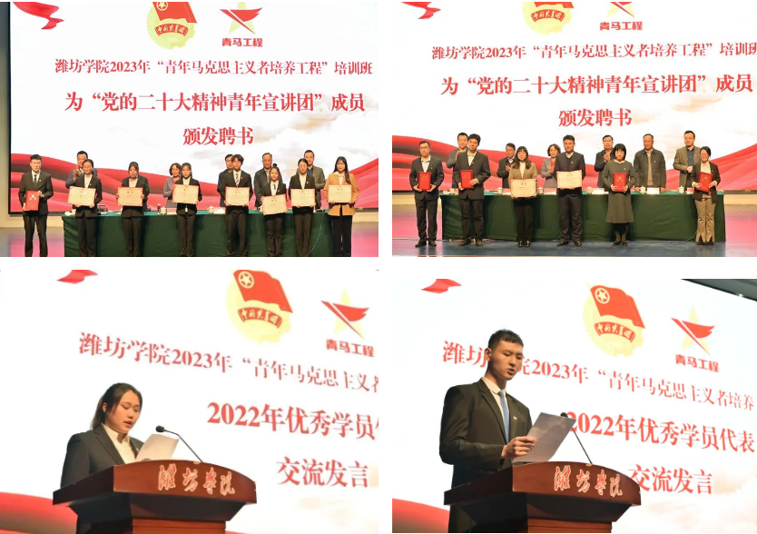 开班仪式上,团委副书记江浩浩宣读了“党的二十大精神”青年宣讲团成员名单,与会领导为青年宣讲团成员颁发了聘书,并为上一期优秀学员代表颁发了结业证书,优秀学员代表作了交流发言。