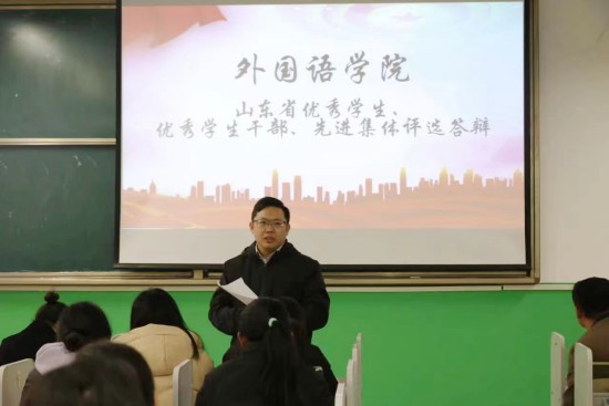 为顺利开展山东省优秀学生、优秀学生干部和山东省先进班集体的评选,2023年3月16日下午,外国语学院在至善楼3236教室举行省级优秀学生、优秀学生干部和先进班集体答辩会,此次答辩会由外院党总支副书记刘希美、副院长张华、副教授王文辉、优秀青年教师韩伟伟和19级优秀学生代表担任评委及嘉宾,21与22级学子以观众身份参与了本次活动。