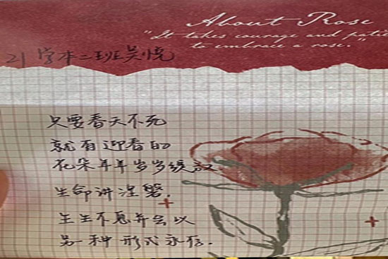 21学本2班的吴悦同学在纸条上写着:“只要春天不死,就有迎春的花朵年年岁岁绽放,生命讲涅槃,生生不息并会以另一种形式永存!”是的,英勇先烈们虽然已经远去,但他们的精神将在当代青年的身上不断流传。