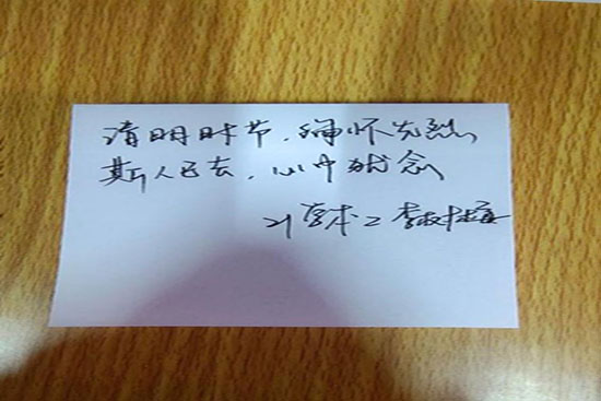 21学本2班的李树梅同学在她的纸条上写着:“清明时节,缅怀先烈,斯人已去,心中犹念!”短短16个字,写尽同学们对先烈们的缅怀和思念之情。