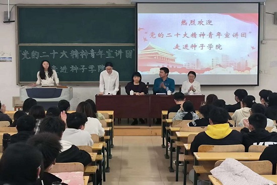 为了深入学习贯彻党的二十大精神,推进党的二十大精神走进校园,4月17日下午,种子与设施农业工程学院开展了党的二十大精神青年宣讲团走进种子学院宣讲活动,化学化工与环境工程学院团总支书记马永生老师、中国化马克思主义教研室副主任高海杰老师、计算机工程学院周晓晗同学、教师教育学院尤晓彤同学以及种子学院2022级全体同学参加了此次宣讲。
