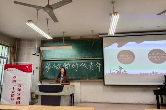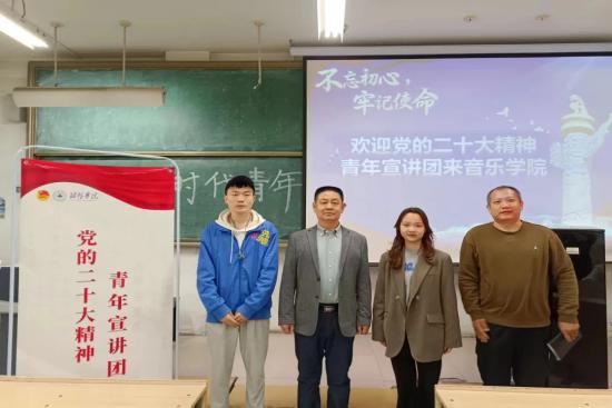 为深入学习宣传贯彻党的二十大精神,引导广大青年正确认识时代责任,筑牢感党恩、听党话、跟党走的意识,4月18日下午,音乐学院在T209举行“党的二十大精神青年宣讲团”走进音乐学院宣讲活动。音乐学院党总支副书记葛汝鸿、团总支书记刘江虹、机械学院学生代表赵桂彬、政法学院学生代表武冠君以及音乐学院全体学生骨干参加宣讲会。